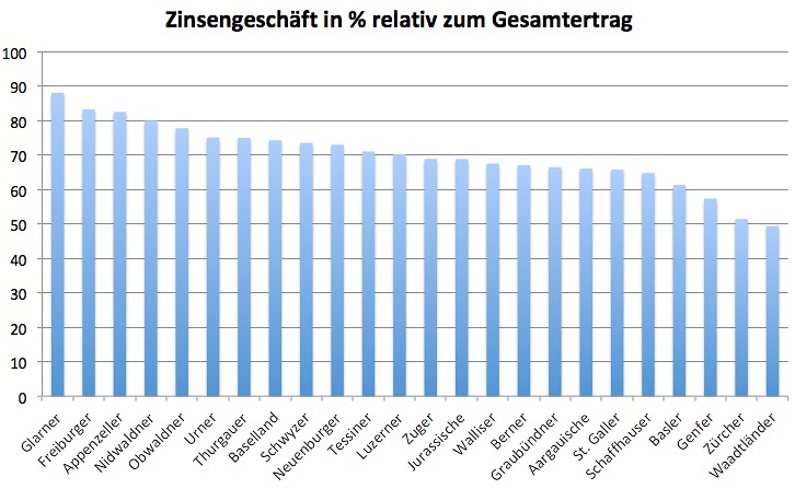 Mit rund 88 Prozent hängt die Glarner Kantonalbank am stärksten am Zinstropf, gefolgt von der Freiburger und der Appenzeller Kantonalbank mit je 83 Prozent (siehe Grafik).