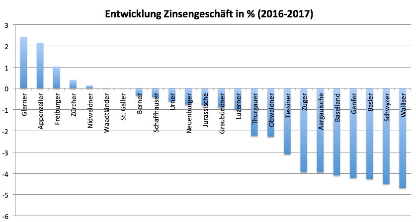 Die obige Grafik zeigt auch, dass 19 von 24 Instituten ihren Anteil am Zinsengeschäft gehalten oder reduziert haben – namentlich die Walliser, Schwyzer, Basler oder Genfer Kantonalbank.