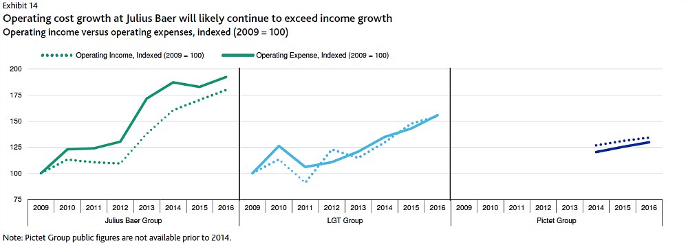 Der Minuspunkt, den Moody's festhält: Während sich die Kundenvermögen seit 2012 verdoppelt haben, stiegen die Erträge kumuliert um über 80 Prozent, während die Kosten deutlich über 60 Prozent anstiegen (siehe Grafik oben). Den Analysten ist darum klar: Julius Bär muss an der operativen Stärke noch arbeiten, die Effizienzgewinne aus den diversen Akquisitionen sind noch nicht realisiert.