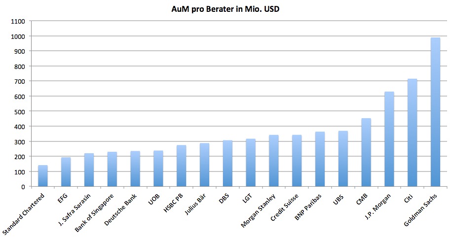 Die Kennzahl ist ein wichtiger Hinweis auf die Effizienz der Banken: Dass die Amerikaner hier an der Spitze stehen, hat primär mit der Eintrittshürde zu tun. So akzeptiert beispielsweise Goldman Sachs erst Kunden ab einem Vermögen von 10 Millionen Dollar.