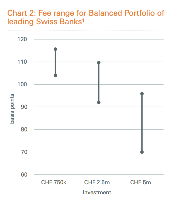 Für ein ausgewogenes Portefeuille im Wert von 750'000 Franken mit nur zwei Transaktionen pro Monat zu 2 Prozent des Gesamtwerts etwa fallen durchschnittliche Gebühren von 111 Basispunkten an (siehe Grafik unten). Der Unterschied zwischen dem günstigsten und dem teuersten Angebot beträgt dabei 11 Basispunkte. Wenn der Kunde hingegen 5 Millionen Franken zu den gleichen Parametern anlegt, dann sinken die Gebühren zwar auf durchschnittlich 87 Basispunkte – die Spanne zwischen den Angeboten klettert aber auf 25 Basispunkte.