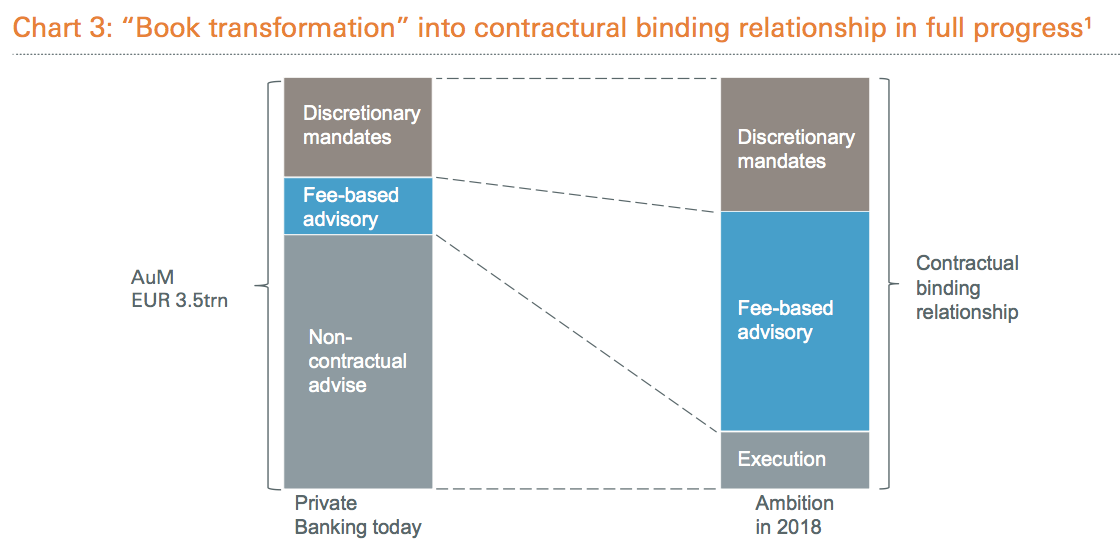 Laut dem DWS-Report «Paying for investment advice – a Private banking revolution» ist im Schnitt erst ein gutes Viertel der hiesigen Private-Banking-Kunden in diskretionären Mandaten eingebunden. In den zukunftsweisenden Beratungsgebühr-Modellen befindet sich gar nur etwa jeder achte vermögende Kunde. Bis 2018, so die Ambition, soll sich dort aber mehr als die Hälfte der Kundschaft einbringen (siehe Grafik unten).