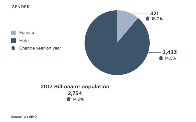 Noch nie – und das ist die Überraschung des diesjährigen Reports – zählte die Welt zudem so viele Milliardärinnen. Wenn den Erhebungen zu trauen ist, ist ihre Zahl mit 18 Prozent gar schneller gewachsen als jene der männlichen Schwerreichen mit 14,5 Prozent (siehe Grafik unten). Wealth X führt das hohe Wachstumstempo einerseits auf Erbschaften zurück; allerdings habe auch die Zahl der weiblichen Entrepreneure zugenommen, die es zu grossen Vermögen gebracht haben.