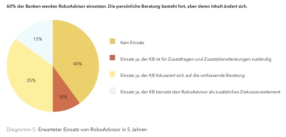 Dieser überraschend hohe Einsatz von Robo-Advisorn, also von Maschinen, dürfte zwangsläufig auch das Aufgabenfeld der Kundenberater «aus Fleisch und Blut» verändern. Konkret erwarten die Banken, dass sich ihre Kundenberater zukünftig auf noch komplexere Beratungen werden fokussieren müssen.