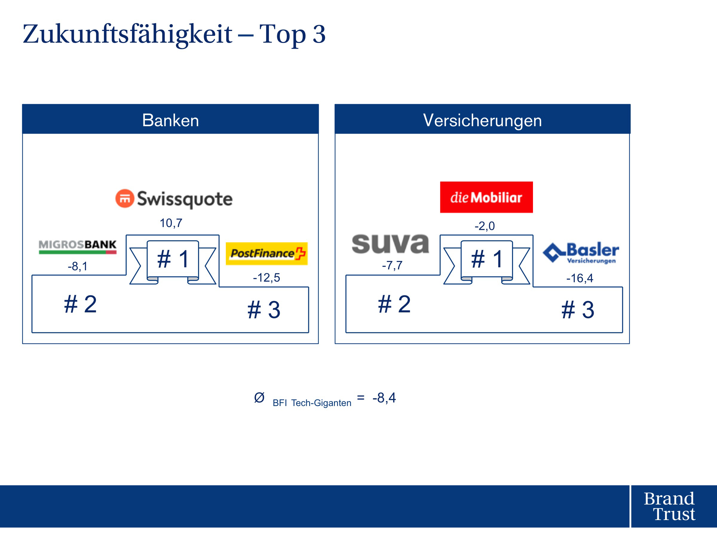 Trotzdem trauen die Kunden ihren Banken und Versicherungsmarken ein langes Leben zu. Hier hilft der Vertrauens- und Gewohnheitsaspekt von stabilen Marken. Marken leben länger als Geschäftsmodelle und «kaufen» dem Management Zeit für den Umbau.
