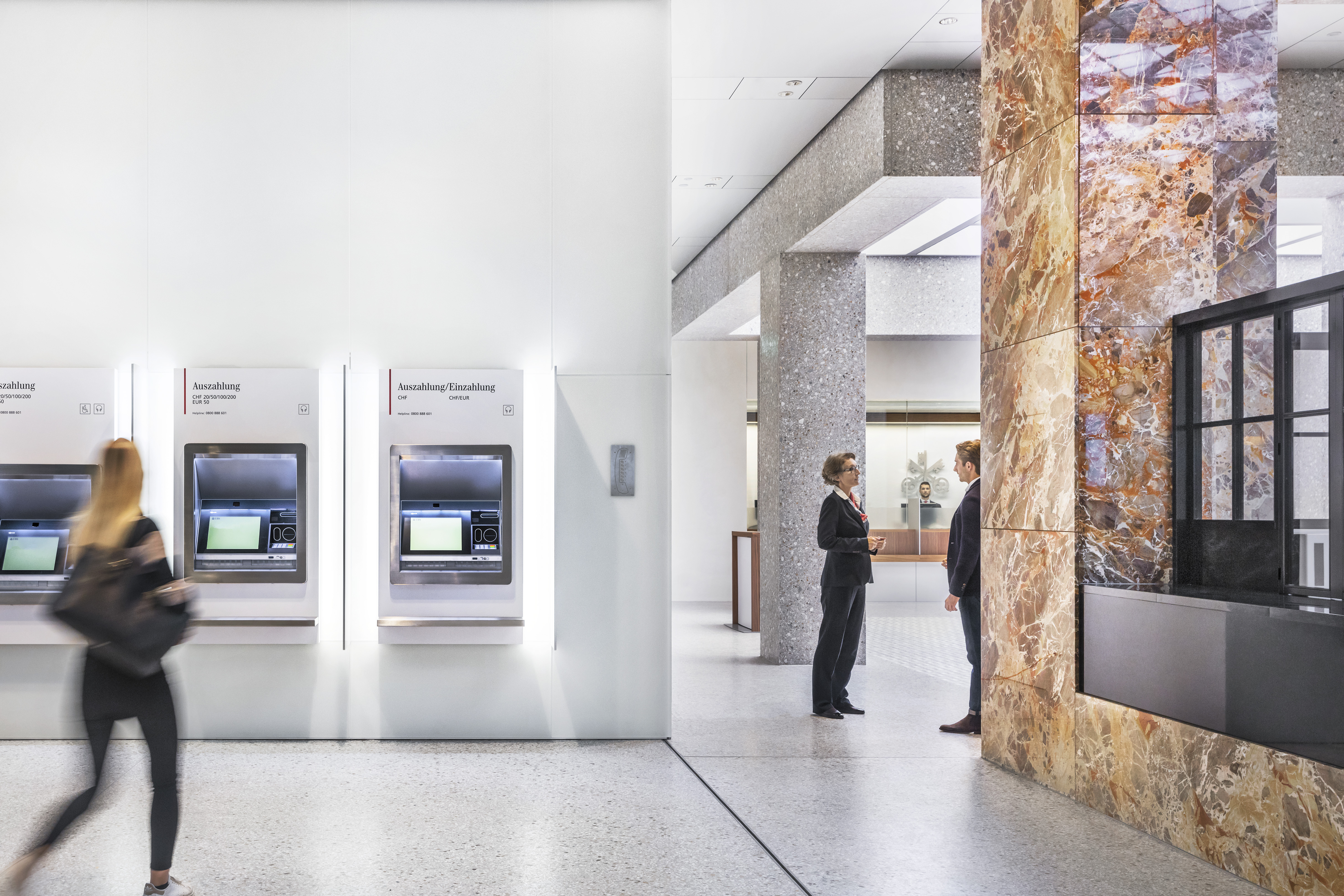 Der Automatenbereich der Filiale wird sieben Tage die Woche und rund um die Uhr geöffnet sein. Neben den Automaten verfügt die Filiale über drei klassische Bankschalter, sechs Besprechungszimmer und einen Kundentresor.