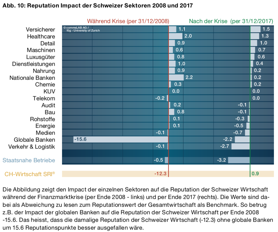 Doch wie die rechte Seite der Grafik zeigt, haben die Banken dieses Tief in den letzten Jahren durchschritten. Interessanterweise stehen dieselben Banken heute – zumindest was die Reputation betrifft – besser da, als staatsnahe Betriebe wie die SBB oder die Post.