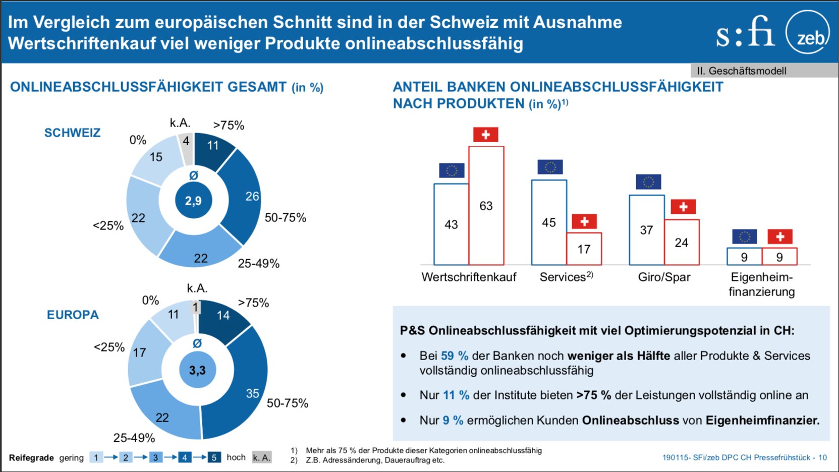 Eine weitere Erkenntnis der Zeb-Publikation zeigt allerdings, dass die entsprechende Reaktionsfähigkeit nicht unbedingt gegeben ist. Bei den meisten Banken in der Schweiz lassen sich weniger als die Hälfte aller Dienstleistungen vollständig online beziehen (siehe Grafik).