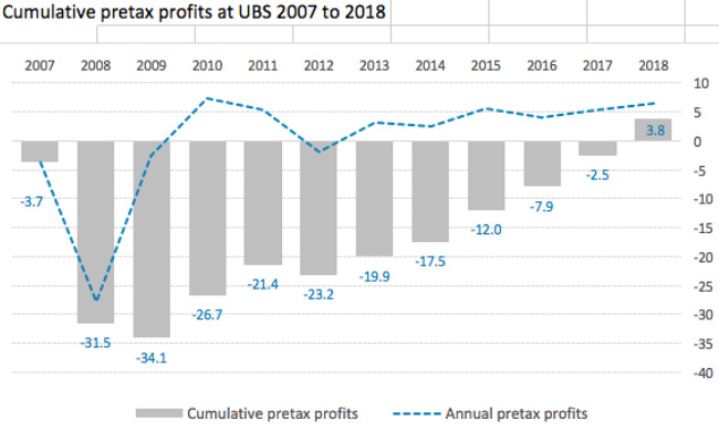 Trotzdem verbirgt sich hinter dem Resultat auch ein positiver Aspekt: Mit den 4,9 Milliarden Dollar Jahresgewinn hat die UBS unter CEO Sergio Ermotti die Verluste der Finanzkrise von 2007 bis 2009 aufgearbeitet. In dieser Zeit verlor die Bank fast 30 Milliarden Franken.