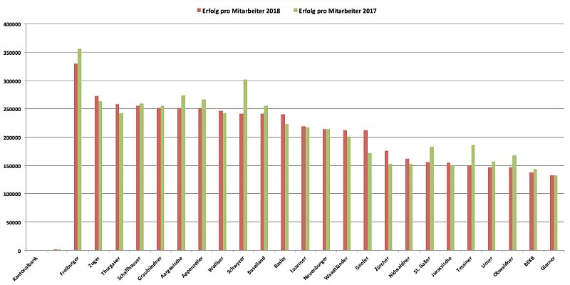 Die Umwälzungen haben unterschiedliche Gründe – und sie sind teils Sondereffekten geschuldet, wie beispielsweise bei der AKB. Dort drückten tiefere Auflösungen von Kreditwertberichtigungen auf den Geschäftserfolg. Dies schlug sich in einem um rund 23'000 Franken niedrigeren Erfolg pro Mitarbeiter nieder – doch mit einem Nachlassen der Mitarbeitereffizienz hat dies nichts zu tun.