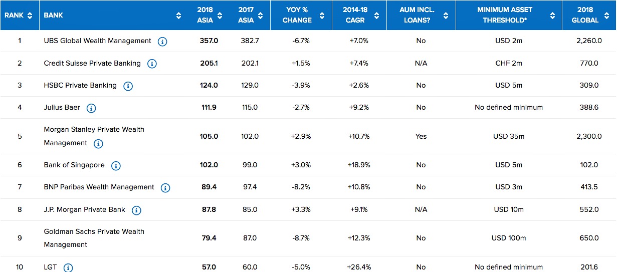 In der Rangliste fehlen die amerikanische Citigroup sowie die in Singapur domizilierte DBS Bank. Sie zählen zu ihren verwalteten Vermögen jeweils auch sogenannte Affluent-Gelder hinzu, also Kunden mit Beträgen zwischen 250'000 und 500'000 Dollar, was nicht der klassischen Definition im Private Banking entspricht. Darum wurden sie in dieser Rangliste dieses Jahr weggelassen.