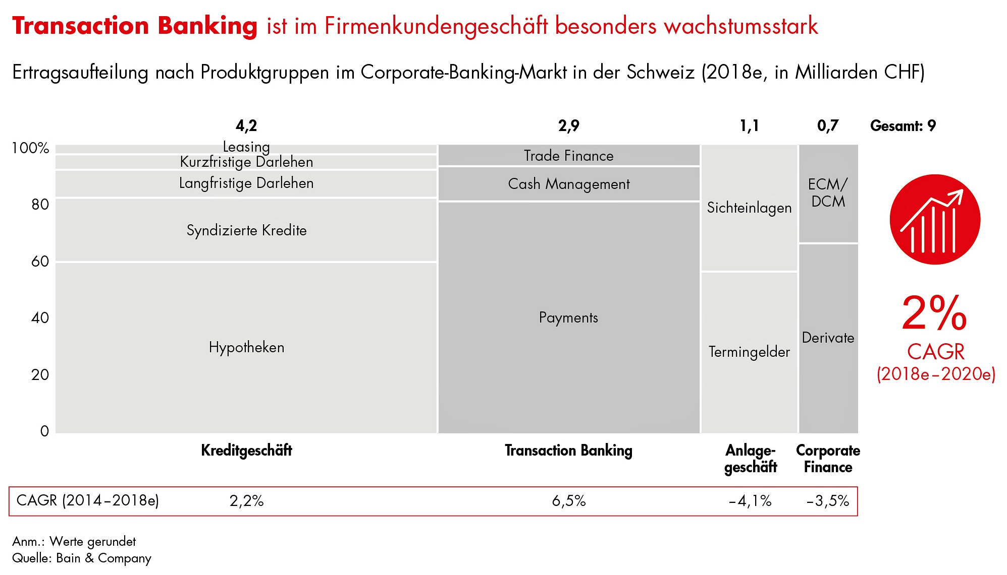«Die Banken sollten mehr daran setzen, sich ein Stück vom wachsenden Firmenkundengeschäft zu sichern», sagt Huber. Die Erträge der Banken mit Corporate Banking stammen zu 80 Prozent aus dem Kreditgeschäft sowie aus dem Transaction Banking und zu 20 Prozent aus Einlagen und Corporate Finance. Als besonders wachstumsstark erwies sich in den vergangenen Jahren das Transaction Banking (vgl. Grafik oben).