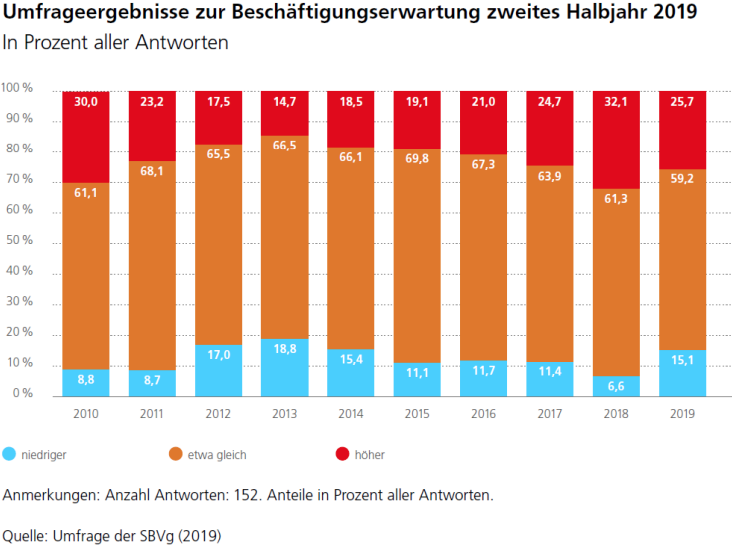 Laut der SBVg könnte die Abwärtsspirale aber schon bald ein Ende haben. Denn wie sie in einer Umfrage unter den Schweizer Banken (Bild unten, für volle Grafik anklicken) erfahren hat, geht ein Grossteil der Schweizer Banken, und zwar immerhin rund 60 Prozent, davon aus, dass die Beschäftigung im zweiten Halbjahr 2019 in ihrem Institut gleich bleiben wird.