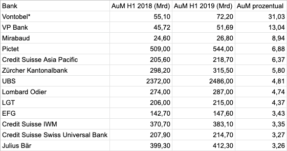 Die Genfer Privatbanken Pictet und Lombard Odier sowie EFG International weisen ihre verwalteten Vermögen aus dem Private Banking halbjährlich nicht separat aus, weswegen bei ihren Angaben die Asset-Management-Vermögen enthalten sind. Dies schränkt die Vergleichbarkeit zwischen den verschiedenen Banken bezüglich der Höhe ihrer verwalteten Vermögen ein.