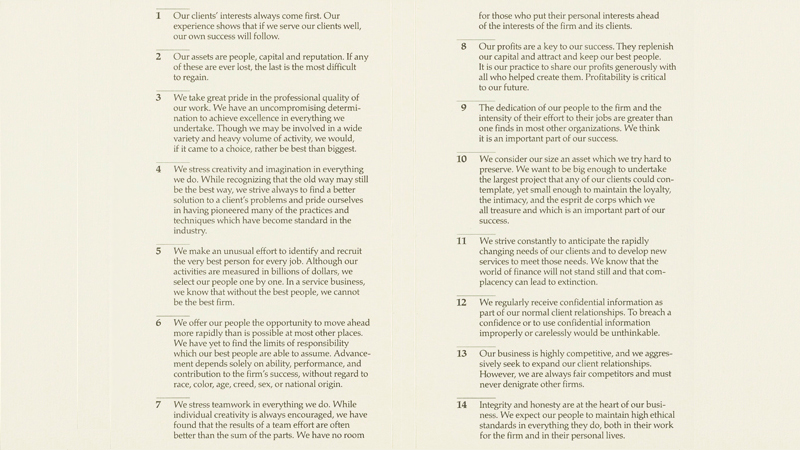 Trotzdem sind die Veränderungen in der traditionsgeprägten Firma bemerkenswert. Unter Solomon werden im Zuge der Sprachinitiative erstmals die Prinzipien (siehe Bild oben) angepasst, welche das Handeln der Banker seit 1979 bestimmen.