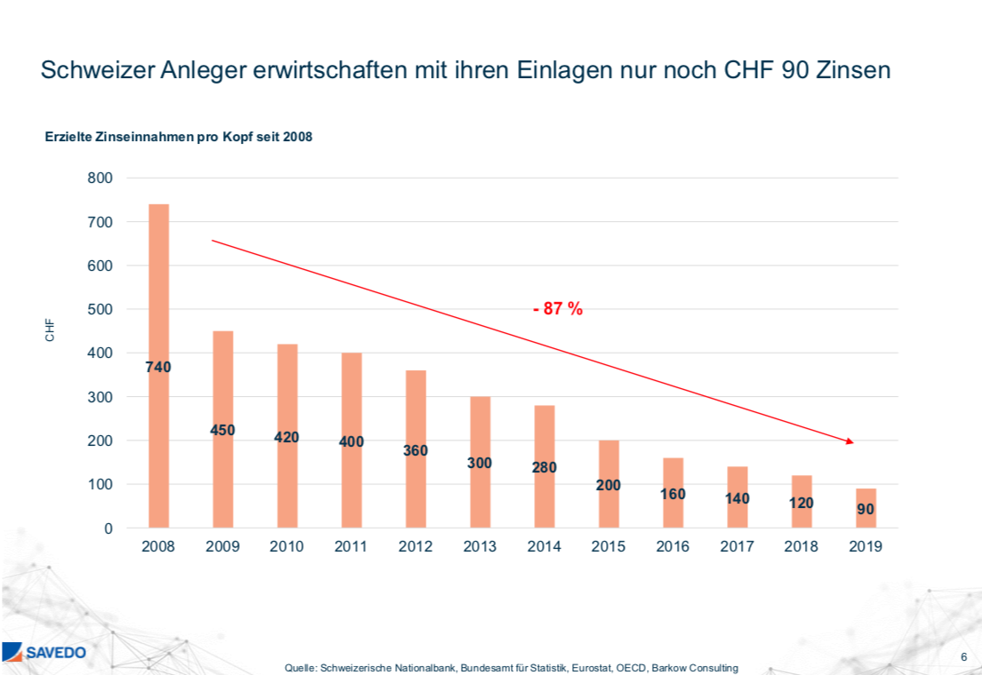 «Sparer müssen sich darauf einstellen, dass das Niedrigzinsumfeld weiter anhalten wird», sagt Thomas von Hohenhau, der Schweiz-Chef des Fintechs Deposit Solutions, welches die Savedo-Plattform betreibt. «Hinter uns liegt bereits ein Jahrzehnt jenseits der Norm. Der Niedrigzins hat ein tiefes Loch in die Taschen der Schweizer gerissen. Ihr Einlagenvermögen steigt Jahr für Jahr, obwohl die Rendite schon lange nicht mehr stimmt.»