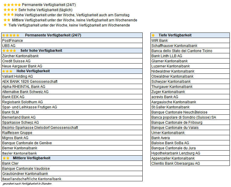 Exakt die Hälfte der 50 grössten Schweizer Retail-Banken verdiente sich allerdings aufgrund ihrer tiefen Verfügbarkeit nur einen Stern. Darunter sind vier Banken, deren Telefone über Mittag 1,5 Stunden ruhen.