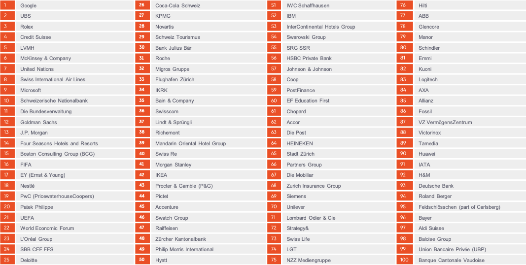 Im Vergleich zum letzten Ranking, über das finews.ch ebenfalls berichtete, hat sich zumindest an der Spitze der bei 4'331 Wirtschaftstudenten beliebtesten Firmen (Bild unten, zum Vergrössern anklicken) nicht viel verändert. Neu ist an den Top 3, dass die CS abgelöst wurde, und zwar vom Genfer Luxusuhren-Hersteller Rolex. Auf dem ersten Rang steht nach wie vor – wie eigentlich überall – Google, gefolgt von der anderen Schweizer Grossbank, der UBS.