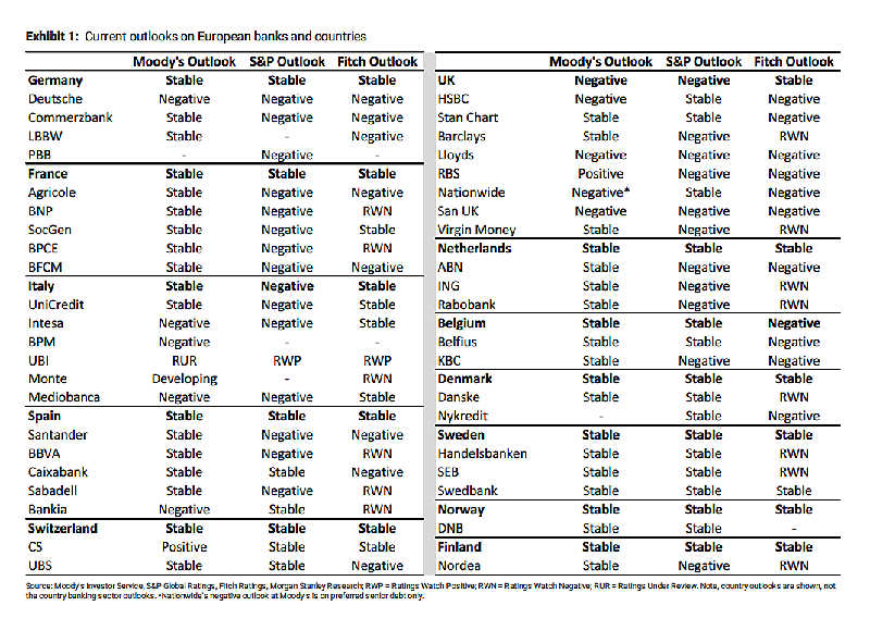 «Sinkende Ratings sind schlechte Nachrichten», so die Morgan-Stanley-Analysten lakonisch. Vor allem für Banken, die damit ihren «Investmentgrade»-Status verlieren würden. Damit könnten ihre Anleihen von gewissen Institutionellen Investoren nicht mehr gekauft werden. Morgan Stanley machte eine Reihe von Banken aus, denen dies blühen könnte: Beispielsweise die spanische Caixabank, die deutsche LBBW oder die italienische Mediobanca.