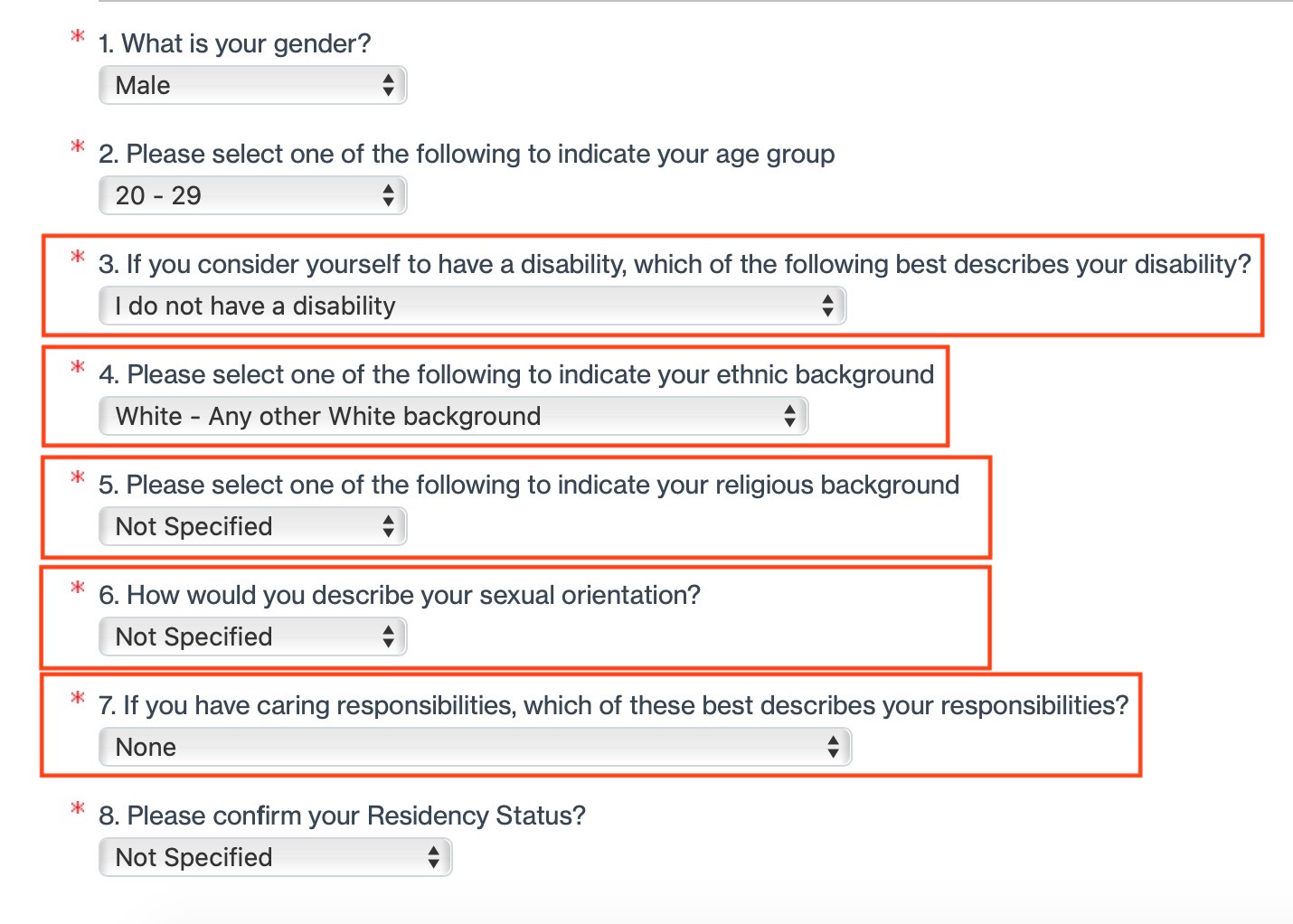Unter anderem musste er seine ethnische Herkunft, seine Religion sowie seine sexuelle Orientierung angeben, wie dem nachstehenden Screenshot zu entnehmen ist.