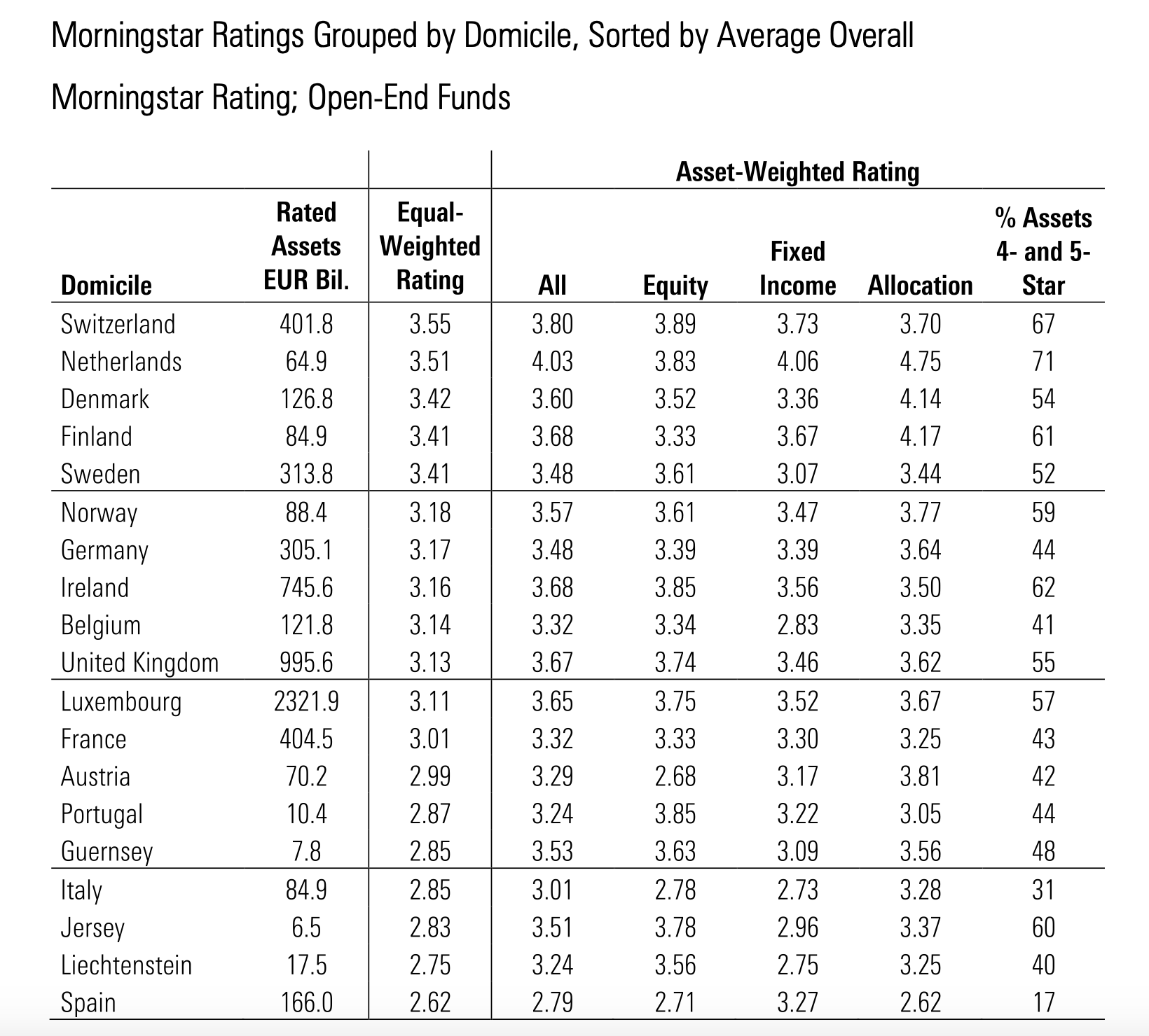 Tiefe Kosten haben eine direkte Auswirkung auf die Gesamtperformance und somit aufs Morningstar-Ranking. Der Schweiz kommt nun sinnigerweise zugute, dass Retrozessionen nach Urteilen des Bundesgerichts weniger zur Anwendung gelangen. Werden Vertriebskosten von den Produktkosten getrennt, schneiden die kostenentschlackten Fonds naturgemäss besser ab als die mit Kickbacks belasteten Vehikel.