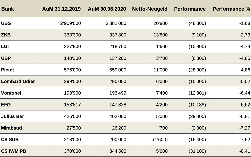 finews.ch machte die Probe aufs Exempel und untersuchte anhand der Angaben zur Entwicklung der Assets under Management und zu den Netto-Neugeldzuflüssen, wie gut beziehungsweise wie schlecht sich die Kundenportfolios im für die Banken so lukrativen Corona-Halbjahr entwickelt haben.