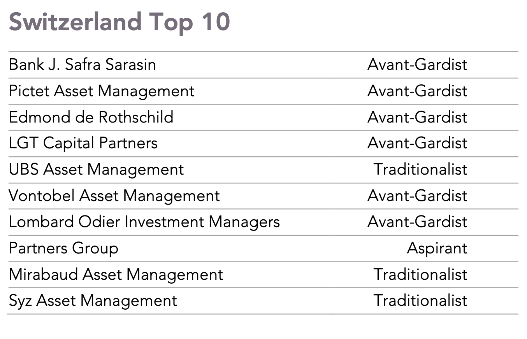 Das Asset Management der UBS, die Schweizer Marktführerin, hat es laut der Studie dank ihrem hohen Engagement für Nachhaltigkeit in die Top-Ten gebracht, dies allerdings als Traditionalistin. Die UBS-Erzrivalin Credit Suisse hingegen schaffte es nicht in die Auswahl.