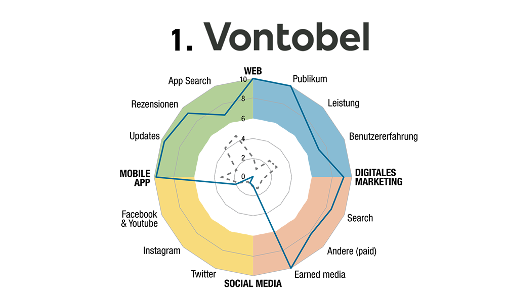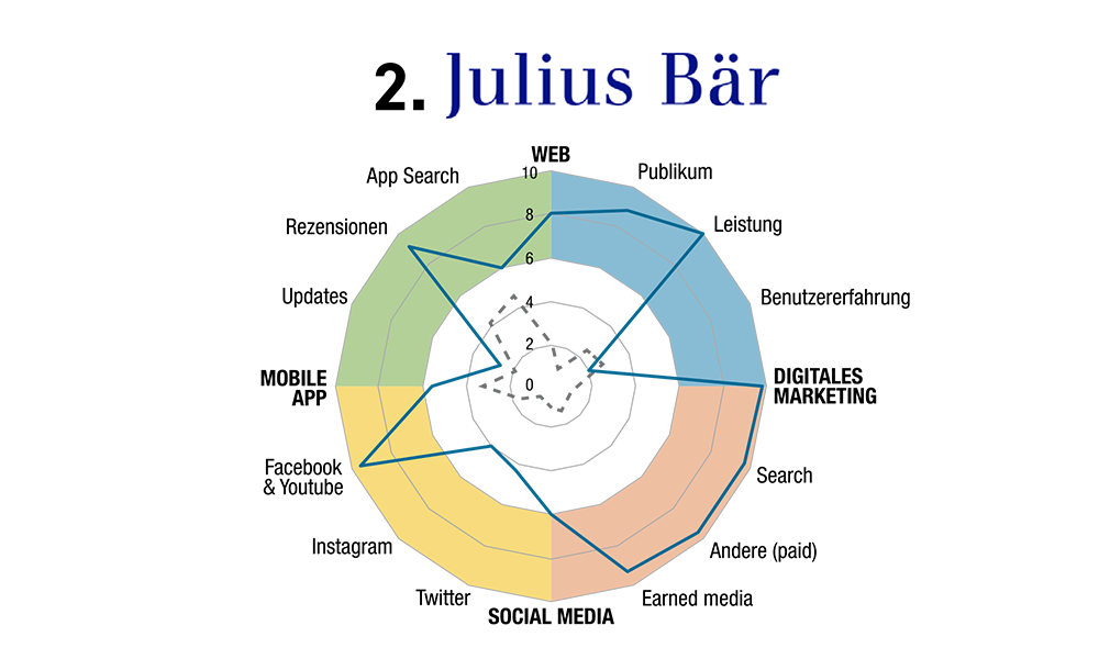 Die zweitplatzierte Bank Julius Bär setzt das digitale Marketing am intensivsten ein und ist im Gegensatz zu anderen Geldhäusern sogar auf populären Social-Media-Kanälen wie Facebook oder Youtube überdurchschnittlich präsent. Gut schneidet auch der generelle Auftritt des Zürcher Traditionshauses im Web ab. Inhalte kommen über eine leistungsstarke Webpräsenz gut zur Geltung (vgl. nachstehende Grafik).