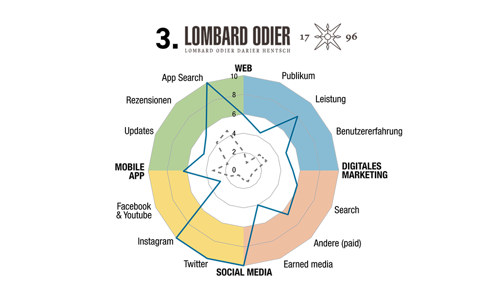Die Genfer Privatbank Lombard Odier zeigt eine allgemein gute Präsenz im Web und überzeugt dabei vor allem mit einer überdurchschnittlichen Interaktion auf den Sozialen Medien wie Instagram und Twitter. Die App überzeugt durch Benutzerfreundlichkeit und einem breiten Content, den die Bank so anbietet. Das passt insgesamt auch zum Anspruch von Lombard Odier, als eine auf Nachhaltigkeit ausgerichtete Bank zu sein, was vor allem die jüngere Klientel (Millennials, Generation Z, NextGen) anspricht (vgl. nachstehende Grafik).