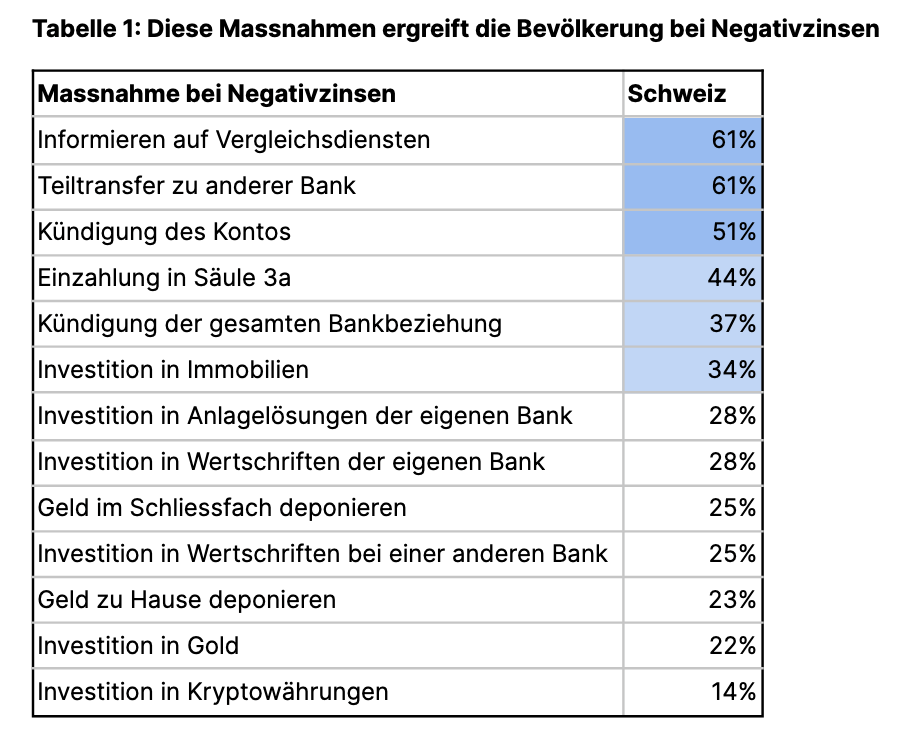 Doch die Strafzinsen könnten aus Bankensicht auch eine lukrative Bewegung in Gang setzen. Denn grundsätzlich scheuen sich die Umfrageteilnehmenden nicht vor Investitionen: Rund 56 Prozent nannten mindestens eine Anlageform (Immobilien, Anlagelösungen, Wertschriften, Gold, Kryptowährungen) als mögliche Massnahme gegen Negativzinsen.