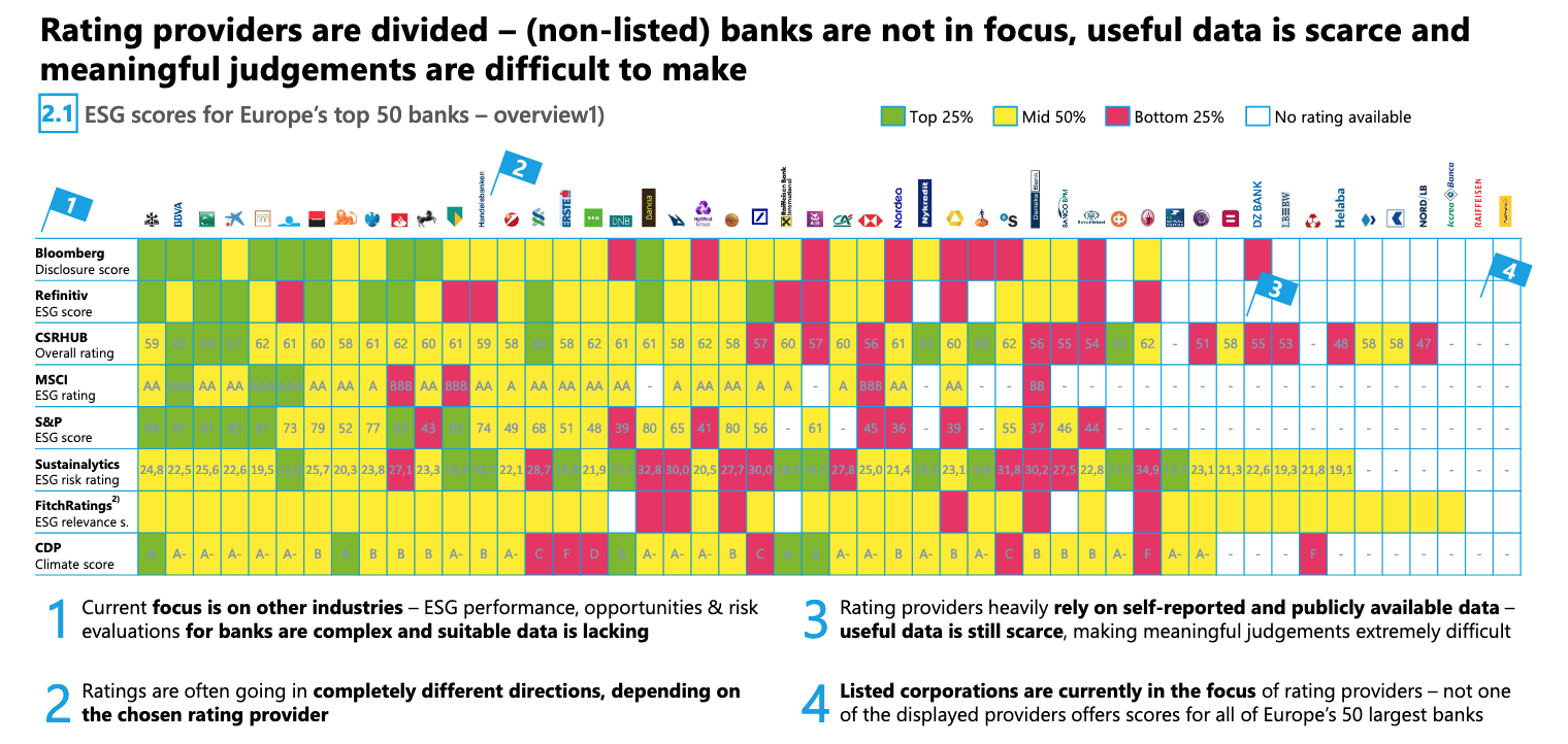 Dies sogar, wenn sie die renommiertesten Ratings am Markt beachten; so den «Disclosure Score» von Bloomberg, den «ESG Score» von Refinitiv oder den «S&P ESG Score» der mächtigen Rating-Agentur Standard & Poor’s. Das Beratungsunternehmen Zeb hat acht solche Nachhaltigkeit-Barometer zusammengetragen und zu einem höchst buntscheckigen Banken-Bild vereint (siehe Grafik unten).