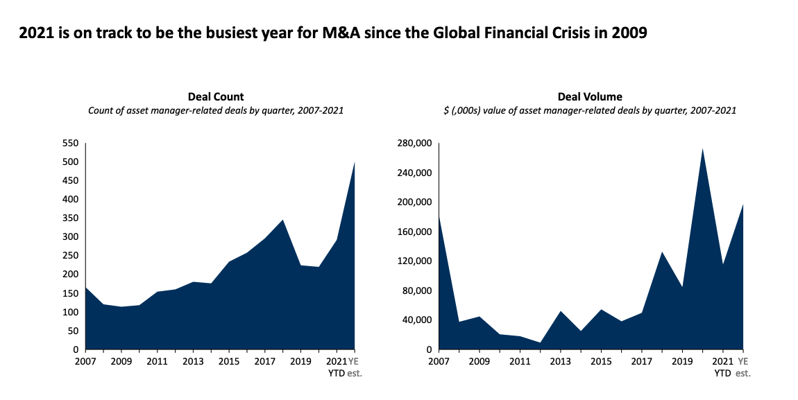 Heute gilt das mehr denn je, wie neueste Daten aus dem globalen Asset Management zeigen. Die zum Big-Four-Beratungsunternehmen gehörende US-Firma Casey Quirk rechnet vor, dass die vergangenen neun Monate das höchste Aufkommen an Fusionen und Übernahmen seit dem Jahr 2007 gebracht haben (siehe Grafik unten). Während 2020 das höchste Dealvolumen aufwies, hat sich nun die Zahl der Transaktionen in der Fondsbranche das Niveau von vor der Finanzkrise erreicht.