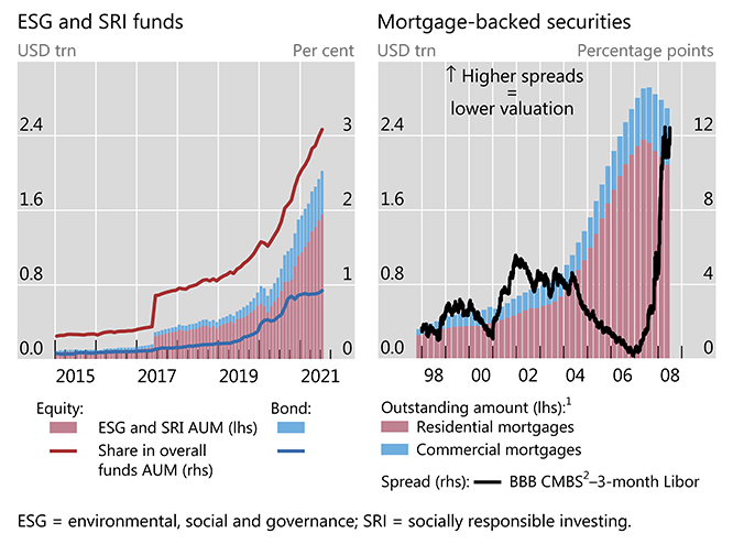 Die damals toxisch gewordenen verbrieften US-Hypotheken zeigten vor Ausbruch der Krise ein ähnlich steiles Volumenwachstum wie nun die unter ESG- und SRI-Etikett vertriebenen Fonds, findet die BIZ (siehe Grafik unten).