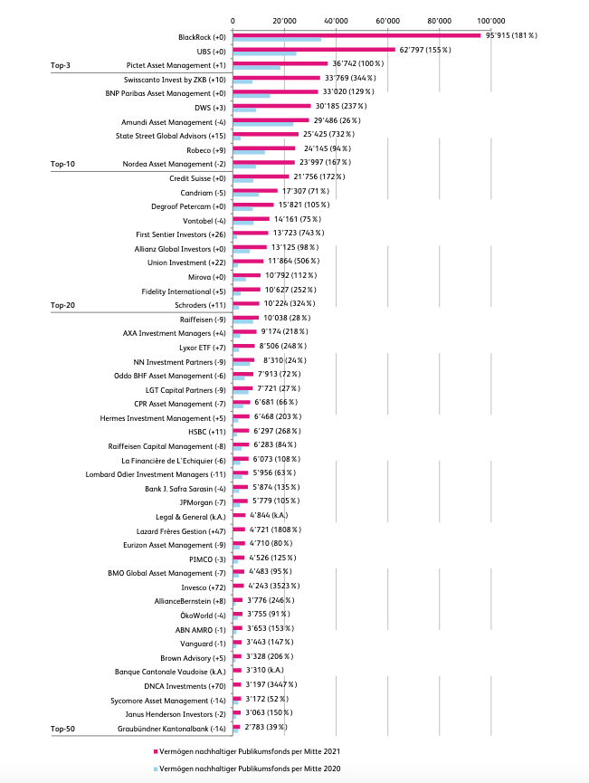 Der erste Platz im Rennen um nachhaltig verwaltete Fondsvermögen geht an einen ausländischen Riesen: Der amerikanische Riese Blackrock konnte von Mitte 2020 und bis Mitte 2021 das Volumen seiner in der Schweiz zugelassenen Fonds auf knapp 96 Milliarden Franken (siehe Grafik unten) steigern. Dies geht aus einer neuen Studie zu nachhaltigen Publikumsfonds der Hochschule Luzern (HSLU) hervor.