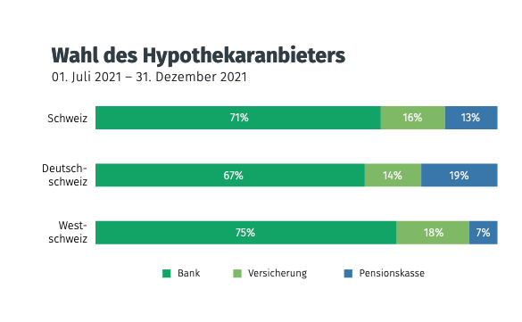 Die Geldinstitute haben demnach im vergangenen Semester mit 71 Prozent Anteil am schweizweit vermittelten Volumen einen Höchstwert erreicht (siehe Grafik unten). Weiterhin liegen zudem mehr als 90 Prozent der Bestandes-Hypotheken auf den Büchern von Banken.