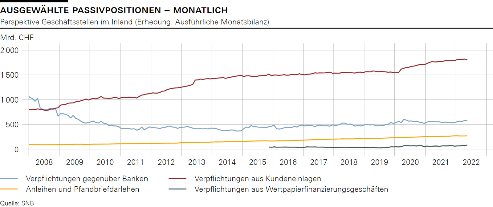 Die Daten der SNB (vgl. obige Grafik) zeigen eindrücklich den Anstieg der Kundeneinlagen seit Beginn der Corona-Pandemie. Von rund 1,54 Billionen Franken stieg der Wert bis auf mehr als 1,82 Billionen Franken im März 2022. Zuletzt hatte es aber auch hier einen leichten Rückgang gegeben. Was mit den Spareinlagen als nächstes geschieht, läuft auf eine grosse Wette für die Retailbanken hinaus.