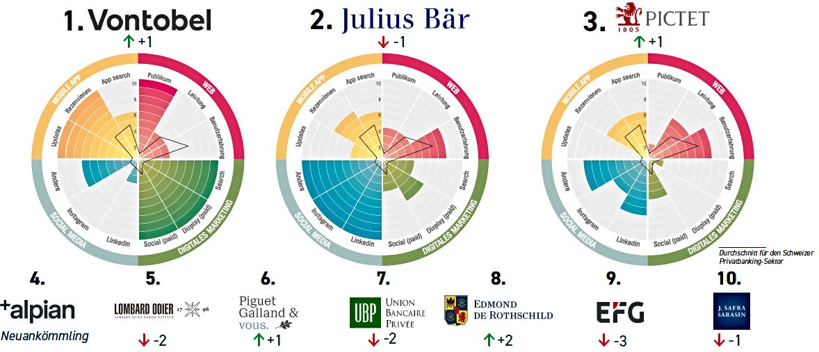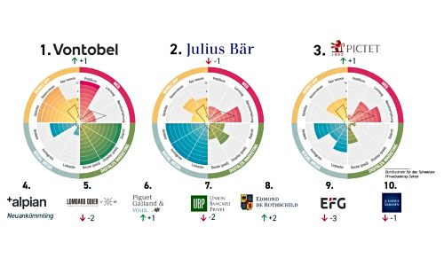 Bei den Bewertungen liegen Julius Bär, Vontobel und Lombard Odier mit klarem Abstand vor den Wettbewerbern (vgl. Grafik unten). Die Rangliste 2023 werde jedoch insbesondere durch den Eintritt von Alpian auf den Kopf gestellt, schreiben die Autoren.
