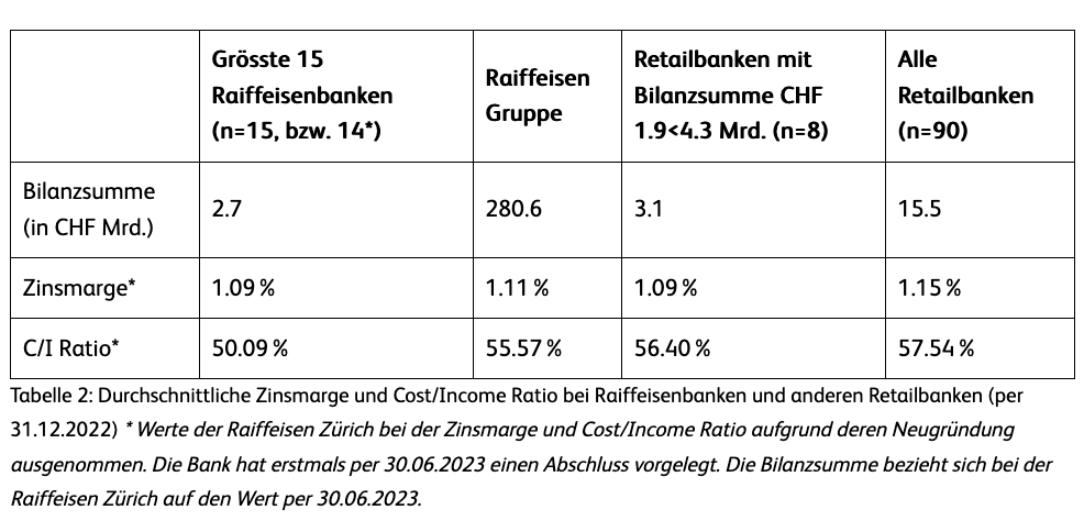 Die durchschnittliche Zinsmarge bei den 15 grössten Raiffeisenbanken beträgt demnach 1,09 Prozent. Diese liegt auf dem Niveau der ganzen Raiffeisen Gruppe (1,11 Prozent) sowie der Retailbanken mit ähnlicher Grösse (1,09 Prozent). Der Durchschnitt aller Retailbanken in der Schweiz liegt leicht höher, bei 1,15 Prozent.