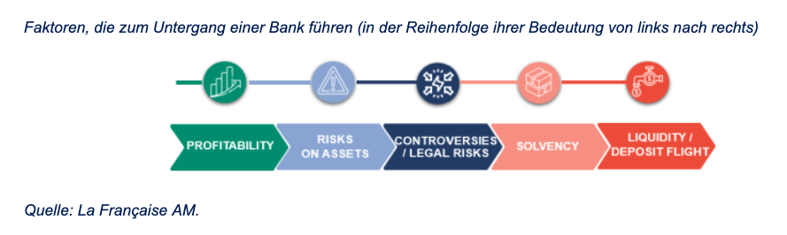 Dennoch glaubt Boudinet, so etwas wie einen Leitfaden der Vorzeichen gefunden zu haben, mit dem sich Anleger schützen können (siehe Grafik unten). Grundsätzlich stellt er fest: «Banken sterben immer aufgrund von Bank-Runs und nicht aufgrund von Solvenz- oder Profitabilitätsproblemen.»