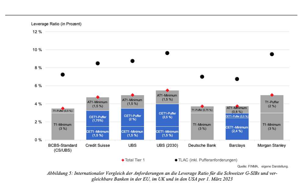 Deutlich mehr Eigenkapital fordert der Bericht vor allem bei den so geannten Parent-Banken, in denen das operative Bankgeschäft unterhalb des Konzerndachs angesiedelt ist. Wie erst der Finma-Bericht zur CS-Krise vom vergangenen Dezember vollständig aufdeckte, war die Parent Bank der CS, die Credit Suisse AG, bereits im Jahr 2022 deutlich schwächer kapitalisiert gewesen als der Konzern und hatte sich damit als schwächstes Glied der Kette bei der untergegangen Grossbank erwiesen.