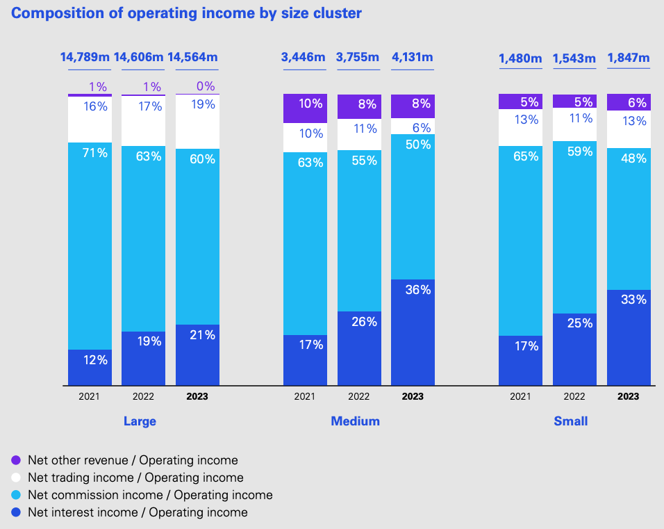 Aufteilung der Erträge auf Handels-, Kommissions- und Zinsgeschäft bei grossen, mittleren und kleineren Privatbanken. Für grössere Darstellung Bild anklicken. (Bild: KPMG Schweiz)