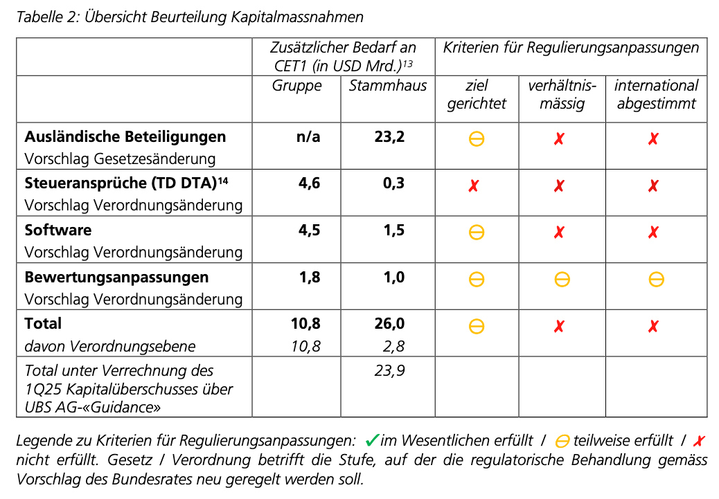 Die bisherigen Pläne des Bundesrates würden die UBS zu einer Aufstockung des Eigenkapitals um rund 26 Milliarden Dollar zwingen, etwa durch die 100-Prozent-Absicherung ausländischer Tochterunternehmen. Davon würde die vom Ausschuss kritisierte Änderung bei der Anrechenbarkeit von Software und Steuerguthaben bei den Kapitalanforderungen für die UBS nach Schätzungen der Regierung mit rund 9 Milliarden Dollar zu Buche schlagen.