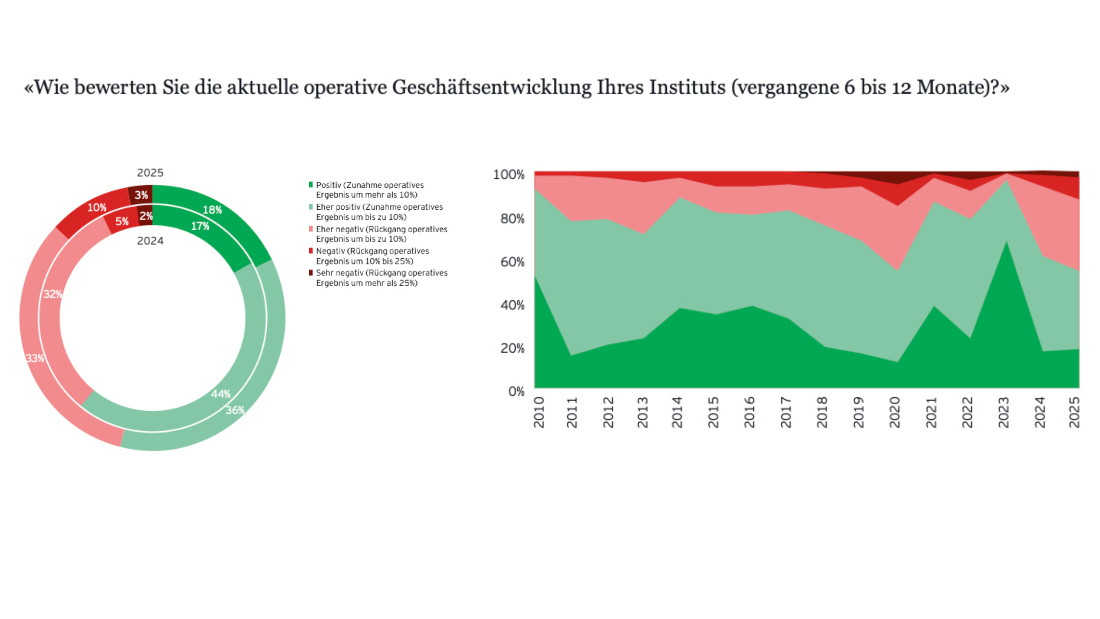 Für das abgelaufene Jahr würden die Banken weiterhin solide Ergebnisse ausweisen, die jedoch unter dem Niveau der vergangenen beiden Jahre liegen werden, heisst es weiter. Fast die Hälfte (46 Prozent) der insgesamt 100 befragten Banken rechnen demnach für das Geschäftsjahr 2025 mit einem rückläufigen operativen Ergebnis. Im Vorjahr lag dieser Wert nur bei 39 Prozent.