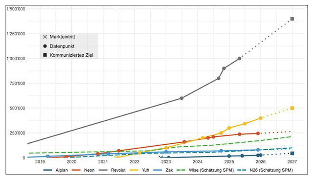 Entwicklung Nutzerzahlen der in der Schweiz aktiven Neobanken 2019-2026 (Werte zwischen den Datenpunkten wurden linear interpoliert; Prognosen ab letztem Datenpunkt sind Schätzungen der Autoren. Daten: öffentlich kommunizierte Angaben der Neobanken, Medienberichte und Swiss Payment Monitor (SPM))