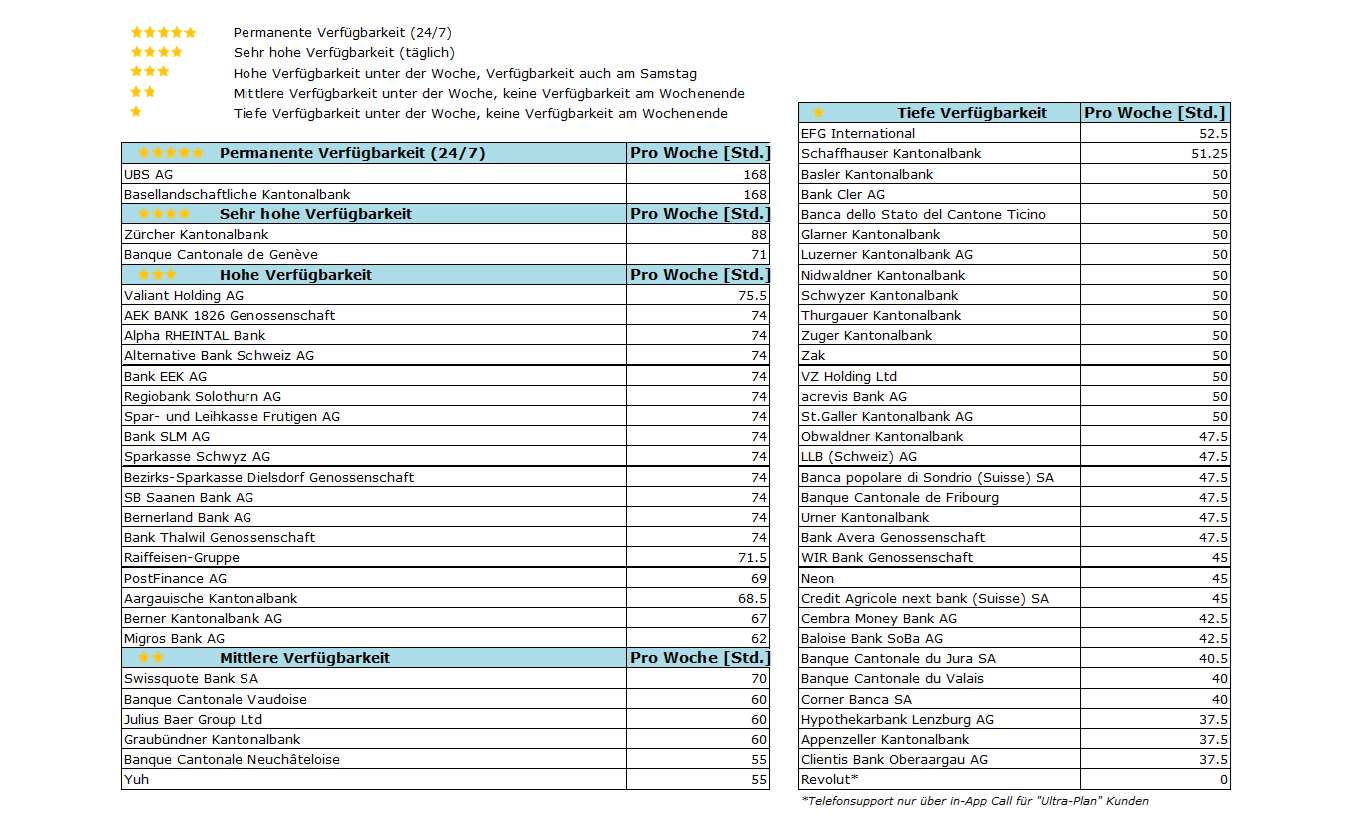 In der Kategorie hohe Verfügbarkeit (3 Sterne) finden sich 18 Institute, die werktags und samstags erreichbar sind. Eine grössere Gruppe – darunter die AEK Bank, die Alternative Bank Schweiz, die Regiobank Solothurn sowie weitere Regional- und Sparbanken – ist an Werktagen von 7.00 bis 21.00 Uhr und samstags von 8.00 bis 12.00 Uhr erreichbar, was 74 Stunden pro Woche entspricht.
