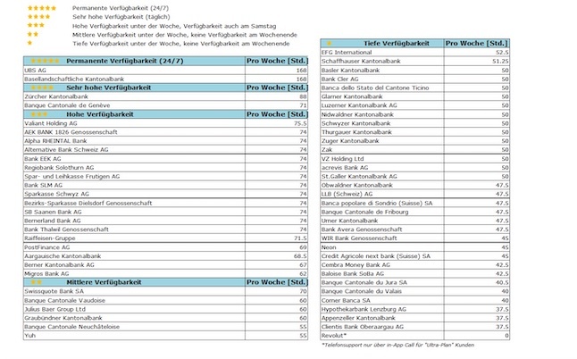 Die Zürcher Kantonalbank und die Banque Cantonale de Genève weisen ebenfalls eine sehr hohe Verfügbarkeit auf. Sie sind sieben Tage die Woche erreichbar, jedoch nicht rund um die Uhr. Das Helpdesk der ZKB ist werktags von 8.00 bis 22.00 Uhr sowie an Samstag und Sonntag eingeschränkt erreichbar und erreicht eine Verfügbarkeitsquote von 52 Prozent. Die Banque Cantonale de Genève kommt auf 42 Prozent und ist auch sonntags – allerdings nur bis 13.00 Uhr – verfügbar.