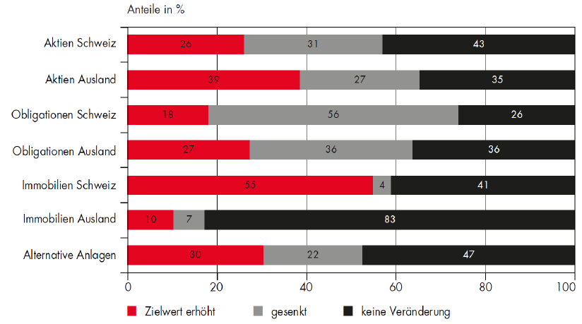 55 Prozent der befragten Schweizer Pensionskassen haben ihren Immobilienbestand in der Schweiz erhöht, nur zehn haben ihr Ausland-Immobilien-Portfolio erweitert. Von den in Immobilien investierten Geldern werden zudem 83 Prozent in Wohnobjekte gesteckt.