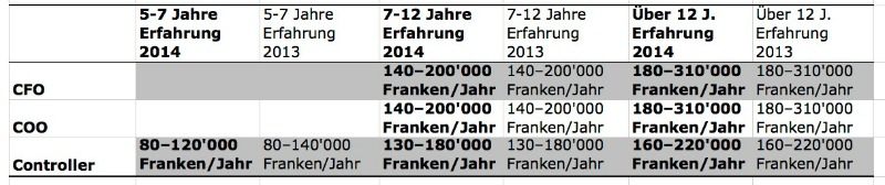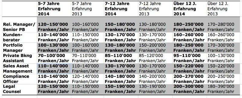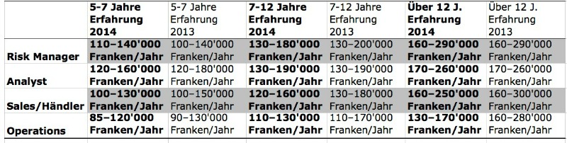 Die Gehälter in der Schweizer Finanzbranche dürften dem Analyse-Papier zufolge 2014 leicht ansteigen – dies nachdem der Lohntrend in den letzten Jahren bestenfalls seitwärts verlaufen war. Der «Abschwung-Modus» in der Finanzbranche sei wahrscheinlich 2014 vorbei, schreibt der Headhunter. Der Arbeitsmarkt für Banken- und Finanzdienstleister habe seit letztem Sommer merklich angezogen.