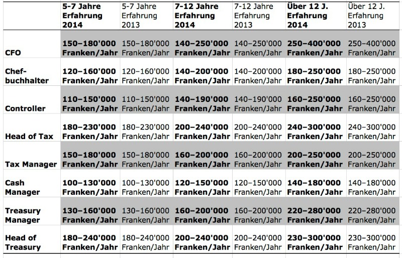 Der global tätige Headhunter Robert Walters, spezialisiert auf Finanz-Stellen, hat im «Global Salary Survey 2014» zwei verschiedene Bereiche analysiert: erstens eigentliche Finanzbranche (mehr hier), zweitens den Arbeitsmarkt im Finanz- und Rechnungswesen.