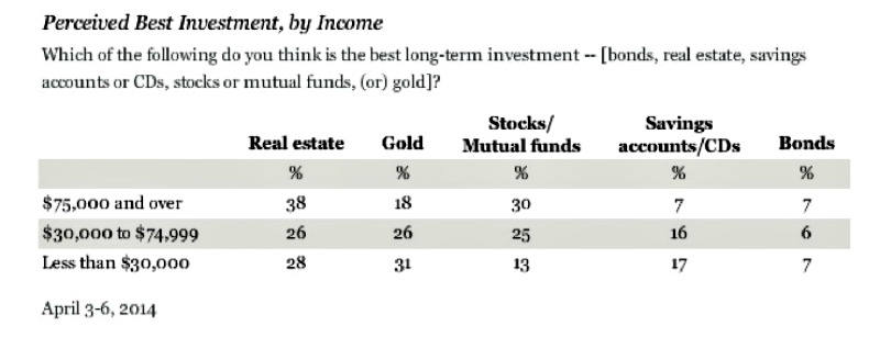 Insgesamt halten derzeit nur noch 24 Prozent der Amerikaner Gold für das langfristig beste Investment. Das Edelmetall wurde jetzt deutlich durch Immobilien eingeholt, wie die folgende Grafik zeigt.